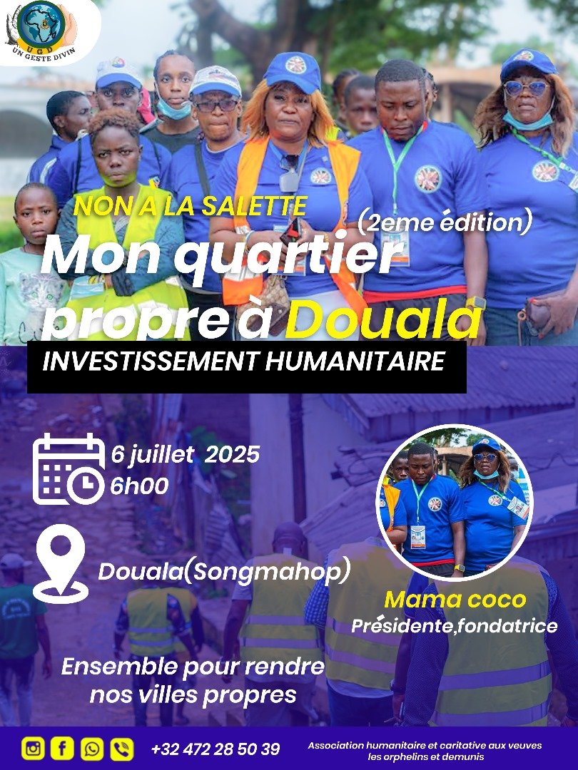 Dans le cadre de sa mission d'investissement humanitaire, l'association UDG UN GESTE DIVIN organise la 2ème édition de son programme "Mon quartier propre" à Douala. Cette action de nettoyage et d'assainissement se déroulera dans le quartier de Songmahops, avec pour objectif de lutter contre l'insalubrité ("NON À LA SALETTE") et de contribuer à l'amélioration du cadre de vie. L'événement rassemble la communauté "Ensemble pour rendre nos villes propres" et reflète l'engagement de l'association envers l'aide humanitaire et caritative.