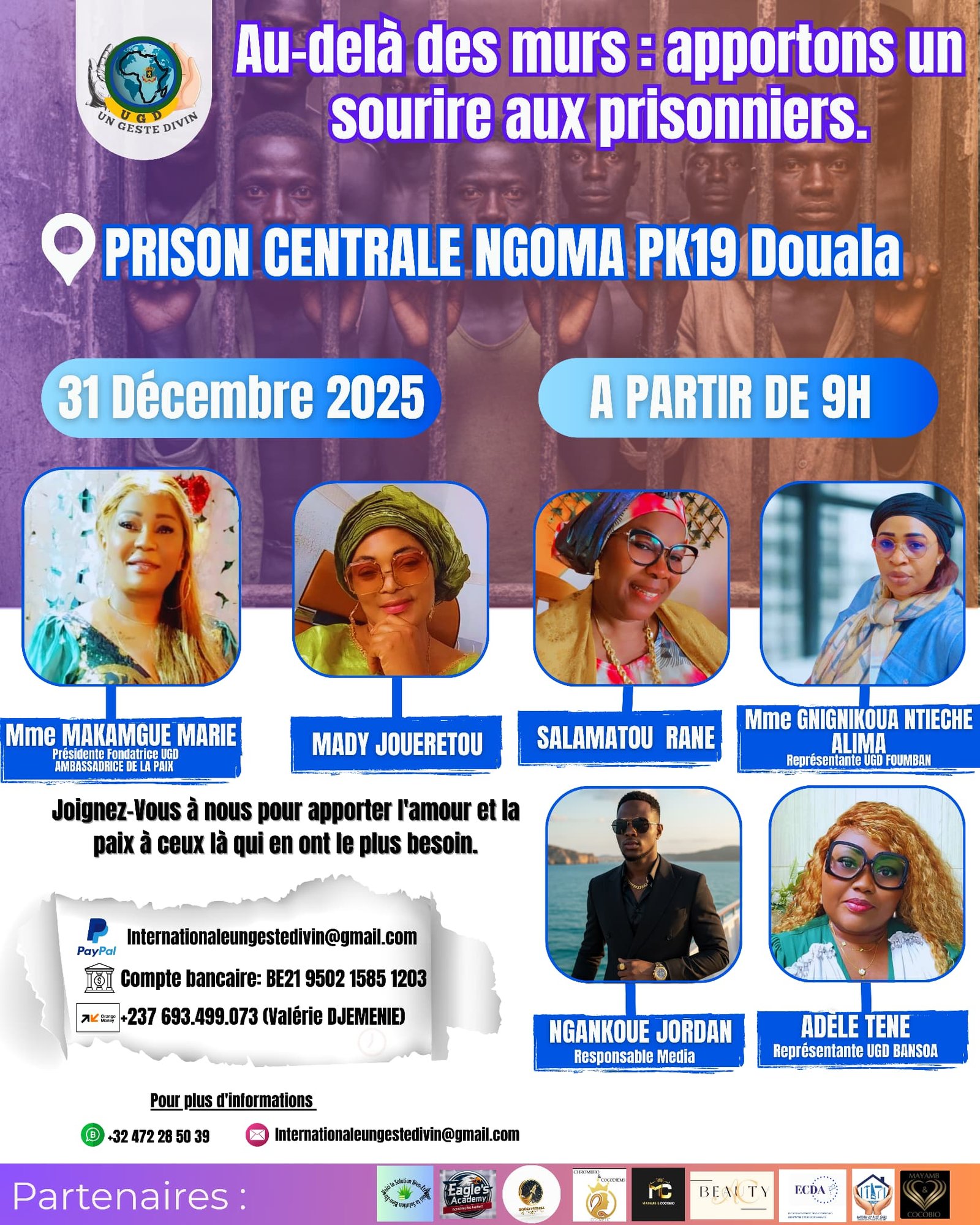 En cette fin d’année, l AISBL"Un GESTE DIVIN Internationale Ungeste Divin " pose un geste fort en se tournant vers nos FRÈRES enfant et SŒURS en détention. Nous serons présents le 31 décembre 2025 à 9h, portés par l’amour du prochain et la foi, pour REMETTRE des DONS (produits de première nécessité, nourriture, vêtements, conseiller etcc…) mais surtout des paroles de RÉCONFORT et D’ESPÉRANCE. Parce que tout le monde ne mérite pas sa cellule. Certains sont tombés, d’autres sont innocents… mais DIEU regarde les cœurs. 📖 Verset de réconfort :* > "Souviens-toi de ceux qui sont en prison, comme si vous étiez prisonniers avec eux." Hébreux 13:3 NOTRE MESSAGE est CLAIR : Refusez l’ancienne vie. Relevez-vous. Dieu donne toujours une seconde chance. Vous avez encore un avenir, une mission, une dignité ! Nous vous aimons. Et nous le prouvons par ce geste. Car c’est le geste qui compte." Avec foi et humanité, Pour Un Geste Divin Internationale 👉 Mme Makamgue Marie – Fondatrice La représentante de foumban mme Alima NTIECHE La représentante de bansoa TENE adèle